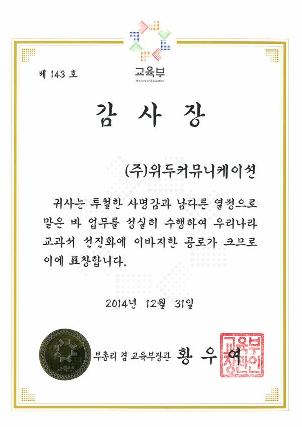 감사장 제 143호 페이지 정보 작성자 WeDu 댓글 0건 조회 5,948회 작성일 19-05-30 19:33 본문 2014-12-31 감사장 제 143호 교과서 선진화 부총리 겸 교육부장관 황우여 List Previous산업통상자원부 표창장 19.05.30 Next한국여성벤처협회 표창장 19.05.30