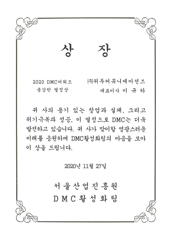 2020 서울산업진흥원 2020 DMC어워드 페이지 정보 작성자 WeDu 댓글 0건 조회 5,616회 작성일 21-12-31 12:57 본문 2020-11-27 2020 DMC어워드 용감한 열정상 서울산업진흥원 DMC활성화팀 List Previous2020 기술혁신 우수기업 21.12.31 Next2018 소년한국 우수 어린이 도서 19.05.30